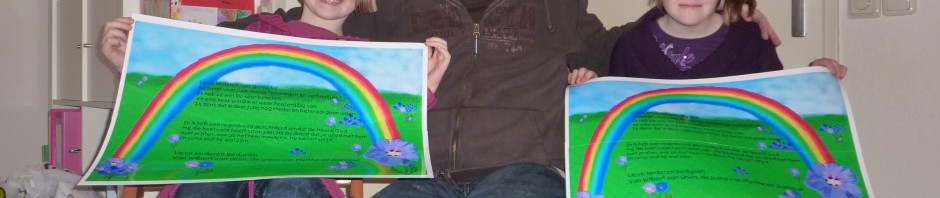 Myrthe en Danique. Die hebben mij zulke mooie verhaaltjes en tekeningen gestuurd op een poster. Dus die wilde ik op een speciale manier bedanken. Dus heb ik een schilderij gemaakt en zelf op poster geprint en aan elkaar geplakt.